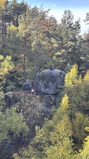 Sotva jsme se vzpamatovali z nálože technik, které jsme se naučili na akci Chytání pádů před dvěma týdny, je tu další horoškolní akce pro nováčky – Sportovky venku, neboli úvod do sportovního lezení ve skalách. Místo činu: Borová skála v Prokopském údolí v Praze.