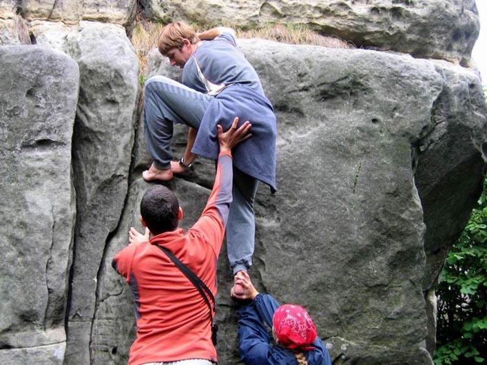 V neděli se udělalo překvapivě hezky, avšak jako čestní Mirkové Dušínové jsme usoudili, že skála je ještě pořád mokrá a tak nepolezem. S tímto názorem jsme byli v Teplicích a Ádru jediní, takže se Brto po zbytek dne užíral, že si nezalezl. Při procházkou teplickým skalním městem pak lezl na různé skály a skalky a bekal, že se nemůže dostat zpátky dolů a ať doběhnem pro lano a zachráníme ho.