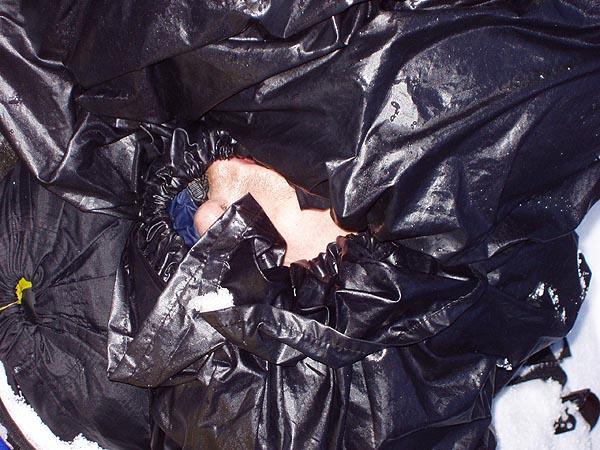 Po ránu byl na tábořiště pohled pro bohy. Několik míst opuštěno pro noční ústup do autobusu, jeden bivakovací pytel volný po evakuaci do auta, zasněžené plachty a pytle, zmačkané tváře a rozcuchané vlasy. Stejně to ale bylo dobrý.