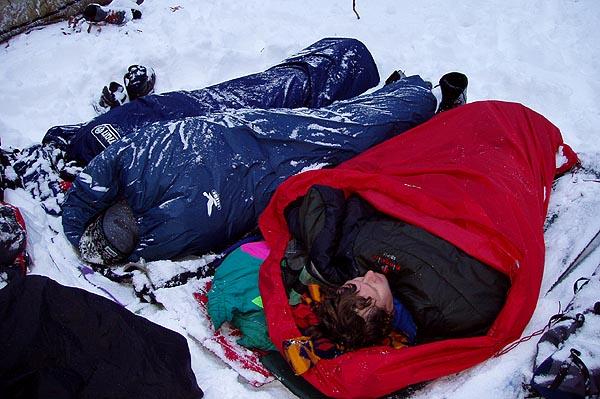 Po ránu byl na tábořiště pohled pro bohy. Několik míst opuštěno pro noční ústup do autobusu, jeden bivakovací pytel volný po evakuaci do auta, zasněžené plachty a pytle, zmačkané tváře a rozcuchané vlasy. Stejně to ale bylo dobrý.