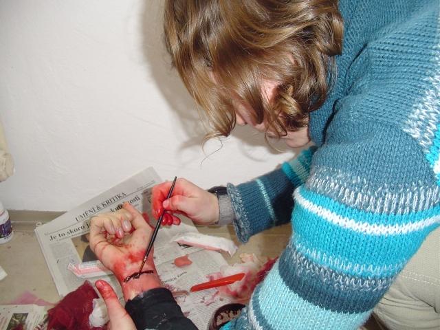 V sobotu Filip zahájil přednáškou Omrzliny a podchlazení, přičemž jsme se kromě praktických rad dozvěděli i fígle typu Kterak amputaci zčernalé končetiny nouzově prováděti apod. Následovalo praktické vyzkoušení poskytnutí první pomoci, což považuji za největší přínos zdravotnické části víkendu. Bára namaskovala Filipovi moc pěkný úraz a pak se na nebohého figuranta vrhaly dvojice zachránců. Až na dvě světlé výjimky (Bidlo+Beruška, Gobo+Renča) zachraňovaný díky obětavé pomoci zemřel, protože nikdo pořádně nevyšetřil páteř.