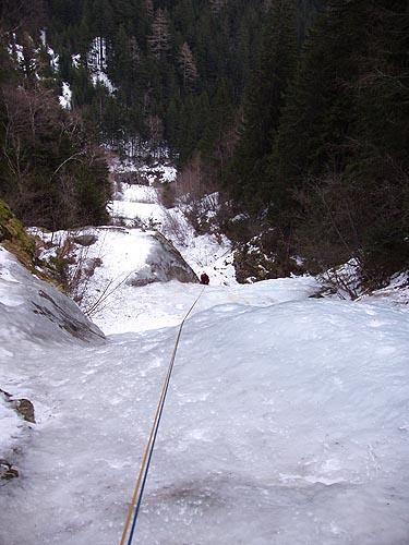 Sobotní odpoledne Bidlo zdolal dvě nejhezčí a nejtěžší délky víkendu v horní části ledopádu Supermax WI 5-. Já za ním dvě nejtěžší asi osmimetrová ledová místa proseděl. Zlaté reverzo!