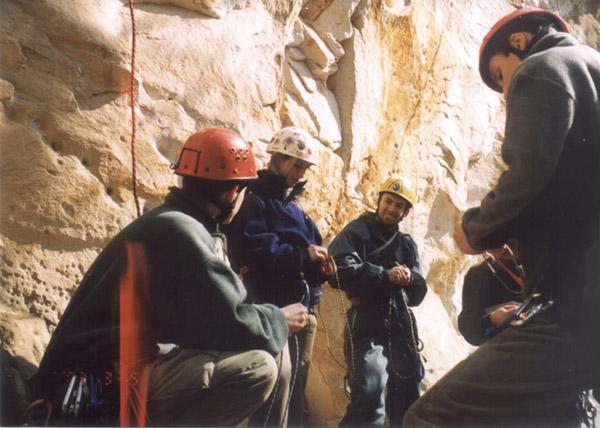 Blud nám přivez lana, spoustu jich nainstaloval a pak celej den vázal novačky do dülfera; Tomas je zase věšel do toho hnusnýho slanění z věže; Kubas se ujal role ferratového vůdce; a nakonec bratři Ovečkovi predváděli šplhání a prusíkování (no, jeskyňáři, znáte je, ty neudělaj po skále krok pěšky).