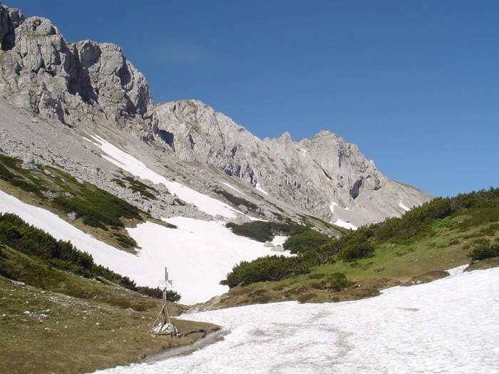 Gedaechtnis Weg, psáno jako 6 A0 nebo 7-. Bylo to hustý! Prvni délku jsem zkoušel třikrát, urval jsem chyt a nezdolal. Pak jsem do ní pustil Radima a protoze je silný jak silnice, přelezl ji. Ve třetí délce jsem se zase snažil já, plotny čistě za 7- byly drsný, tož jsem je velmi mírně oprasil. Přelezl jsem nejtěžsí místo, vymakal sokolíka, po páté expresce mi došlo v dalšímm sokolíku magi a letěl jsem 5 metrů do nejtu. Oklepal jsem se, nalezl to ještě jednou a zase jsem letěl. Tak jsme i zbytek cesty nechali natáhnout Radima a vezli se. Jinak jsme byli pobaveníčko pro celou chatu, protože do cesty je krásně vidět od pivka z terasy....