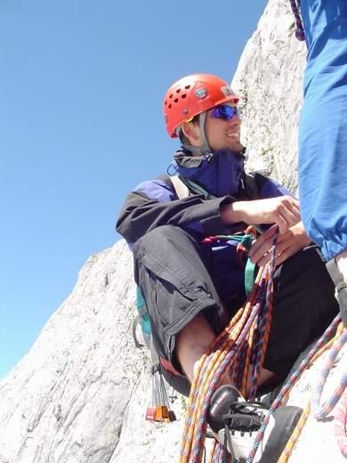 Gedaechtnis Weg, psáno jako 6 A0 nebo 7-. Bylo to hustý! Prvni délku jsem zkoušel třikrát, urval jsem chyt a nezdolal. Pak jsem do ní pustil Radima a protoze je silný jak silnice, přelezl ji. Ve třetí délce jsem se zase snažil já, plotny čistě za 7- byly drsný, tož jsem je velmi mírně oprasil. Přelezl jsem nejtěžsí místo, vymakal sokolíka, po páté expresce mi došlo v dalšímm sokolíku magi a letěl jsem 5 metrů do nejtu. Oklepal jsem se, nalezl to ještě jednou a zase jsem letěl. Tak jsme i zbytek cesty nechali natáhnout Radima a vezli se. Jinak jsme byli pobaveníčko pro celou chatu, protože do cesty je krásně vidět od pivka z terasy....