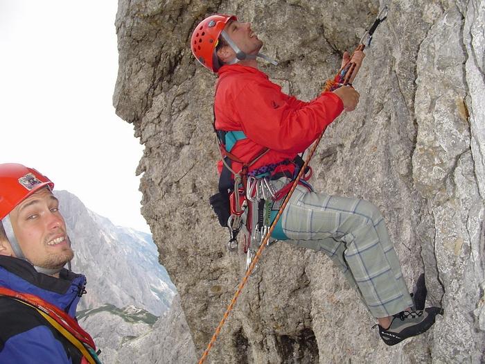 Gedaechtnis Weg, psáno jako 6 A0 nebo 7-. Bylo to hustý! Prvni délku jsem zkoušel třikrát, urval jsem chyt a nezdolal. Pak jsem do ní pustil Radima a protoze je silný jak silnice, přelezl ji. Ve třetí délce jsem se zase snažil já, plotny čistě za 7- byly drsný, tož jsem je velmi mírně oprasil. Přelezl jsem nejtěžsí místo, vymakal sokolíka, po páté expresce mi došlo v dalšímm sokolíku magi a letěl jsem 5 metrů do nejtu. Oklepal jsem se, nalezl to ještě jednou a zase jsem letěl. Tak jsme i zbytek cesty nechali natáhnout Radima a vezli se. Jinak jsme byli pobaveníčko pro celou chatu, protože do cesty je krásně vidět od pivka z terasy....