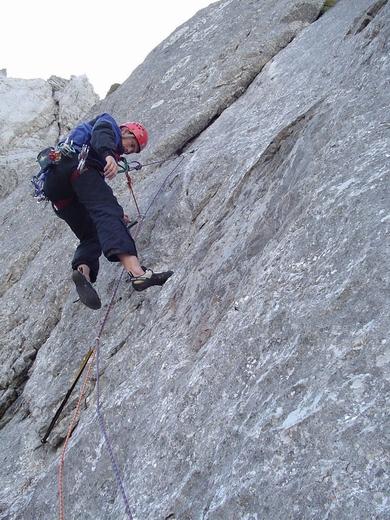 Gedaechtnis Weg, psáno jako 6 A0 nebo 7-. Bylo to hustý! Prvni délku jsem zkoušel třikrát, urval jsem chyt a nezdolal. Pak jsem do ní pustil Radima a protoze je silný jak silnice, přelezl ji. Ve třetí délce jsem se zase snažil já, plotny čistě za 7- byly drsný, tož jsem je velmi mírně oprasil. Přelezl jsem nejtěžsí místo, vymakal sokolíka, po páté expresce mi došlo v dalšímm sokolíku magi a letěl jsem 5 metrů do nejtu. Oklepal jsem se, nalezl to ještě jednou a zase jsem letěl. Tak jsme i zbytek cesty nechali natáhnout Radima a vezli se. Jinak jsme byli pobaveníčko pro celou chatu, protože do cesty je krásně vidět od pivka z terasy....