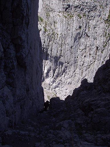 Mokré komíny dole nás připravují o jednu až dvě hodiny z časového plánu, tak jsme nervózní. Hanka nestřídá, čelovku jsme nechali v autě, určitě bude pršet, ale my nevíme, kdy to bude, a sestup také známe jen z popisu v průvodci.