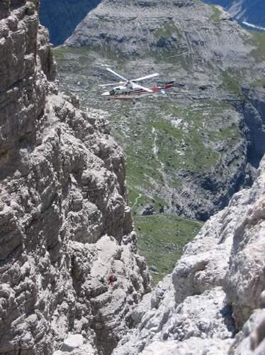 Najednou řev, pád kamení. A po vteřině takové duté žuchnutí. To bylo někde naproti u slaňovací trasy z Cimy Piccola! Okamžitě se ozývá píšťalka a nouzový signál. Je zle, někdo spadnul. Už je dokonce vidím! Jsme jen bezmocní diváci na hrůzném představení. Snažím se to nevnímat a lezu dál. Za čtvrt hodiny ve strži zaburácí helikoptéra. Musíme přerušit výstup, není slyšet slova a stejně se při tomhle nedá lézt. S pohnutím sleduju záchrannou operaci. Vrtulník nejprve krouží a hledá postižené, když je najde, vysazuje dva chlapíky s nafukovacími nosítky na suťovou polici a vzdaluje se. Nutno ocenit špičkovou, až hazardérskou práci pilota. Nalétává ve strži na skálu, aby rozhoupal podvěšené lano do stěny k záchranářům. Přitom rotor helikoptéry se zdá užuž škrtnout o skalní stěnu. Stačil by jeden neohrabaný pohyb rukou pilota, jeden letící kamínek dolů na vrtulník nebo jeden silnější poryv větru v zúžené roklině a byli bychom svědky další tragédie...