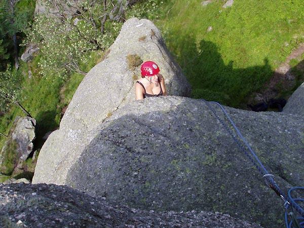 Po několika Kubových hýkavých pokusech jsme síly rázem spojili a s žaludkem v krku, očima navrch hlavy a Kubou pod zadkem jsem se po těch vertikálních mikrokrystalech nakonec vydrala, ale byl to boj. A pětka to taky nebyla. Nebýt Kubových očí na mých nohách a jeho ruky pod nimi... Družstva už jsme nerozpojili a Kuba se pokusil stěnku také dobýt. Po chvíli se v něm však probudili zkušenosti horala a chvátil lano. Káďa je horal již dávno zkušený a tak nezaváhala ani na okamžik a byla nahoře v cuku letu. Pojídač dal taky pokus a pak odevzdaně chvátil. Slaňák byl umístěn velmi rafinovaně, ale oproti předešlému, už slanění nestojí za řeč.