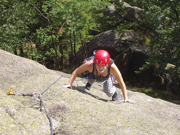 Z vyhlídky na Paličníku jsme si vyhlídli Paličku a hned se na ní vydali. Zamítli jsme trojkovej komín a vrhli se na krásnou plotnu, jakousi Magnetickou cestu za pět. Pronásledována Kubou na druhém prvním konci lana probíhalo vše po labužnicku až k druhému kruhu. Tam jsem udělala několik cirkusových kousků a několikrát vylezla a zase slezla na plošinu kousek výš, s tím, že tamtudy cesta teda fakt nevede. No, Kuba pak ale usoudil, že vede.