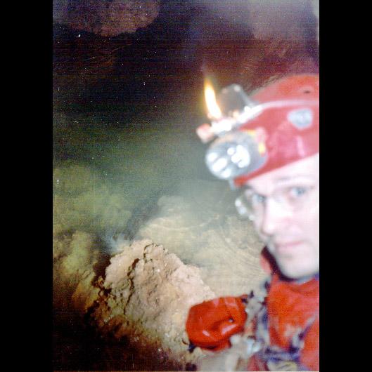 Oveček nelenil, nikde neexkurýroval, místo toho vystrojil lanem sestup do nejhlubších částí jeskyně. Je tu zájemce? Prosím, račte se obléci do úvazů, utáhnout mailonky, lano proplést slaňovátkem, stisknout páku a - pozdravujte dole!