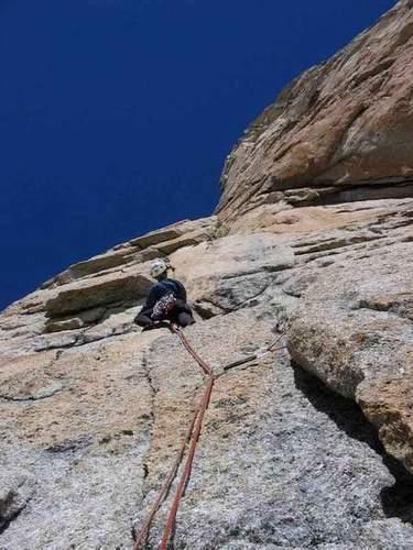 Den D,už dvě hodiny před budíčkem ve mně hučí dvě základní otázky: Vylezem? Přežijem? Vstáváme v šest, se snídaní žádné sr..., hned mačky, navázat a hurá pod stěnu. Přicházíme před půl osmou, stejně s námi dvojka z Englandu a trojka Frantíků, kteří naštěstí polezou vedlejší cestu O sole Mio. Englandi jsou rychlí, držíme s nima krok pouze přes trhlinu. Než se vůbec propracujeme pod vlastní nástup Švýcarské cesty, musíme vylézt šest délek do obtížnosti III. Je tu všechno co si jen alpinista může přát. Černý vodní led, měkký kolmý sníh, tající bahno, drolivá skála, padající kamení nebo pravidelná ledová kanonáda, kterou co chvíli uvolňuje stěna nad náma. Však taky hned schytávám jednu ránu do lokte. Leze Bidloun, ještě že sebou má vývrtky a dva pikle, jinak by to bylo o ukáknutí. Na čtvrté až páté délce necháváme postupně velký batoh s piklama, mačkama i boty a nazouváme lezečky. Sranda začíná. Už první čtyřka docela překvapila. Mírně převislá stěnka se třema skobama. Hákovat, či nehákovat? Jsme pod první těžkou délkou za VI/VI+. Hlásím, že půjdu. V praxi to znamená, ne jednu dýlku, ale celou další třetinu cesty. Nemá smysl ztrácet čas převazováním na každým štandu. Nějak nám v těch těžkých místech zapomněli dávat skoby! Na 40 metrů jen dvě. Úspěšně se dostáváme do velkého kouta, který nás po dalších třech pětkových délkách dovede na R5-velkou polici, kde je jedno stanoviště stejné s O sole mio. Pokračuju koutem mírně vlevo a pak zase spárou doprava do hladkých ploten. Začíná ta pravá Patagonie! Krásné dočervena zabarvené žulové plotny, kouty, spáry a převisy třpytící se v odpoledním slunci. Vzdušné pohledy dolů jen pro otrlé. Nevšiml jsem si štandu vpravo a zaprásknul se. Spára se zužovala, zužovala, až úplně skončila. Co teď? Do malého frenda tři metry pod sebou se mi skákat nechce, nezbývá, než těch sedm metrů šestky z posledních sil zase slézt. Prekérní situace, která řádně pocuchala nervy. Střídáme. Klíčové dvě délky a zbytek do IV+ poleze Hrba. Štandy jsou tady teď zcela visací, vybaveny třemi až čtyřmi skobami a jedním starším nýtem, vše provázané množstvím smyček různého stáří. Budí to celkem důvěru. Aby ne, visíme v tom všichni tři. V kratší délce VI- jsou pouze čtyři zakouslé stopery po předchůdcích, skoby žádné, Hrba si to užívá a hodně dojišťuje vlastním matrošem. Nutno dodat, že zdejší klasifikace je ještě o kus tvrdší než například u nás v Krasu. Na to nejsme zvyklí. My s batohama už částečně hákujeme. Klíčová délka je traverz s převisem nad námi i pod námi, a výlez kolmou spárkou v plotně. Čistě VII nebo A1, A0. Vůbec nechápem čistý přelez, Hrbíno hákuje A0, i když se snaží alespoň si namaglajzovat. Skob mnoho. Lezu druhý, hákuju ze všech sil, až mě chytaj křeče do pravačky. Není tu skoro nic na nohy a blyštivá žula klouže. Vedle mě vpravo se vynoří chlap. Rozbitá cyklistická přilba, spárové rukavice, tenisky na sedáku, ani nehlesne a běží někam nahoru. Kurňa, co je to za lidi? Zřejmě dobrej oddíl, ten chlap běží v osmičkovým terénu!