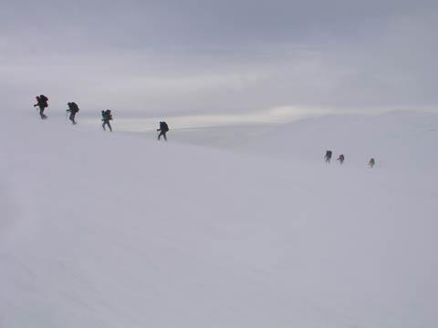 Bylo vidět. Bylo zima. Bylo větrno. Bylo hnusně. Tolik náběhů na omrzliny jsem ještě na jedné túře neviděl. Zbyněk s Vendulou sundávají beztak padající pásy a sjíždí z hřebene na jih. (Ale kdeže: skryti fujavicí a poháněni mlhou jsme uprchlíky pronásledovali až na Prašivou. Tyč od tyče, dokud tyto nesplynuly s okolním bílem, pak už jen po stopách. Ani ty už v houstnoucí tmě nebylo vidět, a protože jsme nechtěli bivakovat na hřebeni vystaveni živlům, odporoučeli jsme se do bezpečí pod alpinskou hranici lesa. Ráno se potvrdilo tušení, že nejsme pod sedlem Hiadeľským, ale úplně jiným, a že tím pádem nebrousíme prašanem pokryté svahy k Donovalům ale na jih do Brusna...Zb.) Na sever je všechno nafoukané, jen slítnout do údolí. Zima, padající pásy, pitomé sjezdy a Bára je v krizi. Kde bere ty náhradní baterky, ze kterých šlape ještě dobré čtyři hodiny? Mlha. Vítr. Sníh řeže do očí.Na Prašivé končí tyče a my proto místo v Hiadialském sedle končíme někde na jih (?) od něj ve svahu v lese. Dusáme plošinky na stany, vaříme, pod vedením Otíka stavíme iglů. Zpíváme, jíme cukroví, Omarek odpaluje Beruščin kaktus.