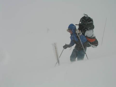 Bylo vidět. Bylo zima. Bylo větrno. Bylo hnusně. Tolik náběhů na omrzliny jsem ještě na jedné túře neviděl. Zbyněk s Vendulou sundávají beztak padající pásy a sjíždí z hřebene na jih. (Ale kdeže: skryti fujavicí a poháněni mlhou jsme uprchlíky pronásledovali až na Prašivou. Tyč od tyče, dokud tyto nesplynuly s okolním bílem, pak už jen po stopách. Ani ty už v houstnoucí tmě nebylo vidět, a protože jsme nechtěli bivakovat na hřebeni vystaveni živlům, odporoučeli jsme se do bezpečí pod alpinskou hranici lesa. Ráno se potvrdilo tušení, že nejsme pod sedlem Hiadeľským, ale úplně jiným, a že tím pádem nebrousíme prašanem pokryté svahy k Donovalům ale na jih do Brusna...Zb.) Na sever je všechno nafoukané, jen slítnout do údolí. Zima, padající pásy, pitomé sjezdy a Bára je v krizi. Kde bere ty náhradní baterky, ze kterých šlape ještě dobré čtyři hodiny? Mlha. Vítr. Sníh řeže do očí.Na Prašivé končí tyče a my proto místo v Hiadialském sedle končíme někde na jih (?) od něj ve svahu v lese. Dusáme plošinky na stany, vaříme, pod vedením Otíka stavíme iglů. Zpíváme, jíme cukroví, Omarek odpaluje Beruščin kaktus.