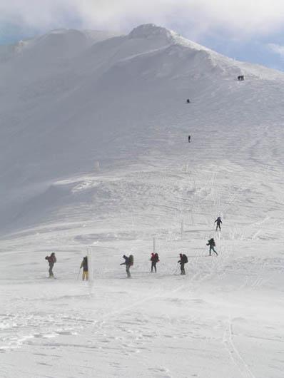 Bylo vidět. Bylo zima. Bylo větrno. Bylo hnusně. Tolik náběhů na omrzliny jsem ještě na jedné túře neviděl. Zbyněk s Vendulou sundávají beztak padající pásy a sjíždí z hřebene na jih. (Ale kdeže: skryti fujavicí a poháněni mlhou jsme uprchlíky pronásledovali až na Prašivou. Tyč od tyče, dokud tyto nesplynuly s okolním bílem, pak už jen po stopách. Ani ty už v houstnoucí tmě nebylo vidět, a protože jsme nechtěli bivakovat na hřebeni vystaveni živlům, odporoučeli jsme se do bezpečí pod alpinskou hranici lesa. Ráno se potvrdilo tušení, že nejsme pod sedlem Hiadeľským, ale úplně jiným, a že tím pádem nebrousíme prašanem pokryté svahy k Donovalům ale na jih do Brusna...Zb.) Na sever je všechno nafoukané, jen slítnout do údolí. Zima, padající pásy, pitomé sjezdy a Bára je v krizi. Kde bere ty náhradní baterky, ze kterých šlape ještě dobré čtyři hodiny? Mlha. Vítr. Sníh řeže do očí.Na Prašivé končí tyče a my proto místo v Hiadialském sedle končíme někde na jih (?) od něj ve svahu v lese. Dusáme plošinky na stany, vaříme, pod vedením Otíka stavíme iglů. Zpíváme, jíme cukroví, Omarek odpaluje Beruščin kaktus.