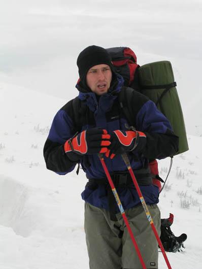 Bylo vidět. Bylo zima. Bylo větrno. Bylo hnusně. Tolik náběhů na omrzliny jsem ještě na jedné túře neviděl. Zbyněk s Vendulou sundávají beztak padající pásy a sjíždí z hřebene na jih. (Ale kdeže: skryti fujavicí a poháněni mlhou jsme uprchlíky pronásledovali až na Prašivou. Tyč od tyče, dokud tyto nesplynuly s okolním bílem, pak už jen po stopách. Ani ty už v houstnoucí tmě nebylo vidět, a protože jsme nechtěli bivakovat na hřebeni vystaveni živlům, odporoučeli jsme se do bezpečí pod alpinskou hranici lesa. Ráno se potvrdilo tušení, že nejsme pod sedlem Hiadeľským, ale úplně jiným, a že tím pádem nebrousíme prašanem pokryté svahy k Donovalům ale na jih do Brusna...Zb.) Na sever je všechno nafoukané, jen slítnout do údolí. Zima, padající pásy, pitomé sjezdy a Bára je v krizi. Kde bere ty náhradní baterky, ze kterých šlape ještě dobré čtyři hodiny? Mlha. Vítr. Sníh řeže do očí.Na Prašivé končí tyče a my proto místo v Hiadialském sedle končíme někde na jih (?) od něj ve svahu v lese. Dusáme plošinky na stany, vaříme, pod vedením Otíka stavíme iglů. Zpíváme, jíme cukroví, Omarek odpaluje Beruščin kaktus.