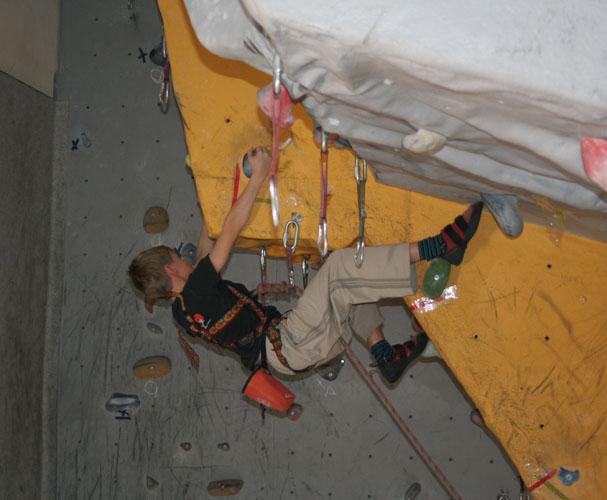 Letos se žádné profesionální stavěče zajistit nepodařilo a tak na stěnu vtrhla parta nadšených amatérů. Díky výpomoci ze spřátelených oddílů nás bylo nakonec celkem osm, tři holky a pět kluků. My jsme se vrhli na stavění holčičí kvalifikační cesty, kluci se rovnou pustili do pánského finále. Protože jsme neměli plošinu, nechtělo se nám oblézat stěnu s vrtačkou a tak jsme se rozhodli oblepit chyty barevnými páskami. Po té, co jsme asi dvě hodiny viseli v cestě jsme zjistili, že pásky zakoupené v Baumaxu jsou na dvě věci a museli jsme to kompletně přelepit. Až do druhého dne nás pak trápila noční můra že přijdeme ráno na závody a všechno bude popadané.
