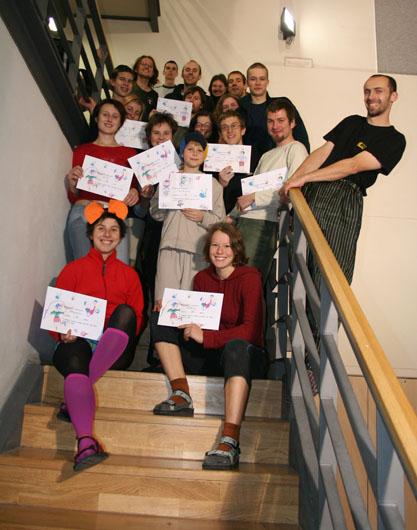 Letos se žádné profesionální stavěče zajistit nepodařilo a tak na stěnu vtrhla parta nadšených amatérů. Díky výpomoci ze spřátelených oddílů nás bylo nakonec celkem osm, tři holky a pět kluků. My jsme se vrhli na stavění holčičí kvalifikační cesty, kluci se rovnou pustili do pánského finále. Protože jsme neměli plošinu, nechtělo se nám oblézat stěnu s vrtačkou a tak jsme se rozhodli oblepit chyty barevnými páskami. Po té, co jsme asi dvě hodiny viseli v cestě jsme zjistili, že pásky zakoupené v Baumaxu jsou na dvě věci a museli jsme to kompletně přelepit. Až do druhého dne nás pak trápila noční můra že přijdeme ráno na závody a všechno bude popadané.