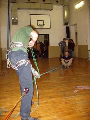 Ještě pár fotek z nácviku tahání z trhliny, které skončilo památným zamotáním Butruse do prusiků metr nad podlahou tělocvičny a jeho půlhodinovým bojem o život.