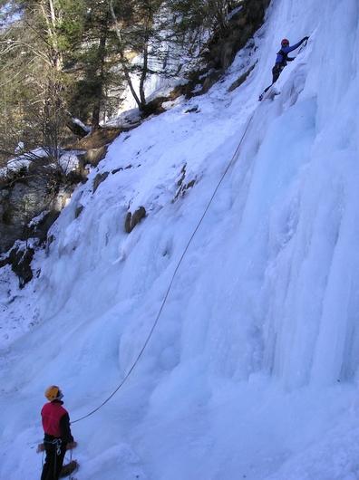Když jsme se konečně přemluvili vstát, pobalit a najíst, tak jsme vyrazili na blízké ledy, kterými je celé údolí téměř poseto. Měli jsme jasno, co kdo půjde - naši kamarádi byli celí natěšení na ledíky a my doufali, že vyplazíme nějaké ty kvaky. Mě sice moc prsty lézt nenechaly, ale přesto bych řekla, že ve stavu nejvyšší nouze se dá na cepínech a hrotech udržet a přežít. Zdatně jsem se tedy snažila aspoň jistit a fotit, i když to mi také nijak extra nešlo. Jinak kluci si celkem obstojně zalezli a celkem nás i zahřálo sluníčko. Pokud by se ale výkony hodnotily podle modřin na kolenou a počtu mačkou proseknutých goráčových kalhot, tak bych jednoznačně vyhrála.