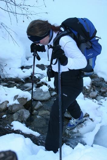 Večer místo zalezení do spacáku jsme čekali na smluvený signál, abychom se vydali směrem na předávací místo. Cestou zpět jsme si pro jistotu ještě asi 20km zajeli, aby to nešlo vše tak snadno. Přečkali jsme nejchladnější noc z těch tří u naší kapličky a ráno v deseti vyrazili na túru na lyžkách. Výběr trasy se úplně nezdařil, jelikož jsme tu správnou odbočku minuli a tak se po dobré hodince a půl chůze, kdy už jsem měla jeden pás přilepený kobercovkou, dostali pod strž, kterou jsme se museli nějak vydrápat nahoru. On ten přemrzlý prašan, který tam byl až po boky, nám to moc neulehčoval. Sklon tohoto trychtýře byl také víc než mohou zvládnout tulení pásy a nutno říct, že mačky na lyže také nebyly k ničemu. Po překonání několika kmenů, křovisek, několika pádech po podjetí lyží, mnoha nadávkách a výkřicích hrůzy se většině výletníků podařilo přes stromy a větve natraverzovat na vedlejší úbočí, které bylo díky jedničce lavinovce celkem schůdné. Což ale neznamená, že jsem i při mohutných serpentýnách neservala i druhý pás. Myslím, že nebudu moc daleko od pravdy, když napíši, že jsme tento úsek tak do dvou hodin měli za sebou. Dva snowboardisti, kteří se drápali nahoru na sněžnicích, dolézali téměř po čtyřech. Tady skončila trasa B-týmu, který si zde vytyčil svůj sobotní vrchol. Tří členný A-tým i v půl třetí stále ještě hodlal dojít na vrchol kopce. Tomáš, Honza a já jsme si stanovili nižší cíl a to dostat se výš, abychom byli schopni přetraverzovat na sjezdovku, jelikož jsme se stále ještě nacházeli úrovní v lese. Prvních 100 metrů nás celkem dobře naladilo než jsme zjistili, že úbočí kterým máme stoupat je většinou vyfoukané na pěkně zatvrdlou krustu, na které to téměř nedrželo ani na hranách. Po necelých 100 výškových metrech jsme stáhli krovky a zaveleli k ústupu. Tím pádem následoval další mohutný traverz přes asi tři úbočí než jsme se dopracovali na jednu cestu. Traverz se neobešel bez občerstvení, pádu na krustě s velmi dlouhou brzdnou dráhou, několika křoviscích v obličeji, baťohu,... Vystoupali jsme dvě zatáčky silnicí a viděli stopy nějakých lyžařů, nadšeně sundali pásy a těšili se na snesitelnou cestu dolů. Terén vypadal na situaci obstojně, krusta sice nechtěla moc pustit, ale jak se zdálo stopy vedly celkem smysluplně a tak jsme si mysleli, že si to dávali nějací místní borci, co odbočili z horních sjezdovek. Když jsme byli asi v polovině kopce zůstali jsme viset nad šíleným zalesněným srázem. Koukáme, že stopy také hledali cestičku a tak nakonec opět kopírujeme jimi najitou trasu a vydáváme se malinko šikmo vzhůru. Po asi padesáti metrech a překročení jednoho potoka, jsme začali zase sjíždět lesíkem. V tom jsme narazili na pořádný potok a viděli, že stopy mizí v hustém lese. Až nyní jsme pochopili, že stopy vytvořil náš B-tým a ne žádní místní znalci. Jenže žádná jiná možnost nebyla než začít sjíždět a už to téměř vypadalo i na čelovky. Doufali jsme, že potok někde nepřechází ve vodopádek a že naši měli štěstí a že se prodrali tím lesem až dolů do údolí. Po několika Tomášových exkluzivních pádech mezi nimiž bych vyzdvihla ten, kdy skončil zaklíněn lyžemi mezi dvěma stromky hlavou dolů a pár dalších maličkostech jsme již za soumraku narazili na běžkařskou stopu, což byla naše výhra a už za 15 minut jsme byli u auta. Překvapilo nás, že B-tým čekal jen 10 min a A-tým 5 min a hlavně fakt dorazili všichni.