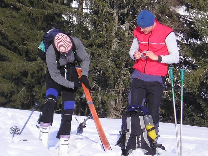 Noc byla ve znamení šílených poryvů větru, menšího sněžení a našeho známeho ranního grüs gott. No neděli už zkrátím. Rozdělili jsme se na dvě auta, jedno šlo na skialp a druhé na ledy. Lyžařská sekce si vybrala spolu s námi vrcholek 2300m, kde silnice byla značená asi do 1300m. Nakonec se jednalo o naprosto neprůjezdnou soukromou silnici, takže jsme skončili vlastně hned na úpatí kopce. Vrcholku jsme nedobyli, ale jak bylo stanoveno cca ve dvě hodiny jsme otáčeli, abychom nějak rozumně dorazili domů. Cesta nahoru byla naprosto pohodová, což ale nevylučuje to, že dva lidé z pěti opět strhli pásy a lepili již osvědčenou kobercovkou. I když pro výstup nebyl přemrzlý prašánek nic extra, sjezd jsme si náležitě užili a všichni ho ve zdraví přežili. Nezastavila nás ani spousta ostnatých drátů křížících nám cestu. Tohle jsem si fakt náležitě užili, nádhera.