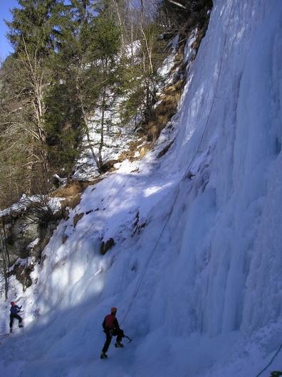 Když jsme se konečně přemluvili vstát, pobalit a najíst, tak jsme vyrazili na blízké ledy, kterými je celé údolí téměř poseto. Měli jsme jasno, co kdo půjde - naši kamarádi byli celí natěšení na ledíky a my doufali, že vyplazíme nějaké ty kvaky. Mě sice moc prsty lézt nenechaly, ale přesto bych řekla, že ve stavu nejvyšší nouze se dá na cepínech a hrotech udržet a přežít. Zdatně jsem se tedy snažila aspoň jistit a fotit, i když to mi také nijak extra nešlo. Jinak kluci si celkem obstojně zalezli a celkem nás i zahřálo sluníčko. Pokud by se ale výkony hodnotily podle modřin na kolenou a počtu mačkou proseknutých goráčových kalhot, tak bych jednoznačně vyhrála.