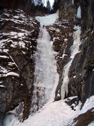 7. Do seznamu známých stylů a technik používání cepínu přibyl o víkendu ještě jeden nový. Takže kromě Matyho expanzivního stylu (lezení obouruč s přískoky), Vencovy obouručky (to když má člověk jen jeden cepín) a Evušina okopávání brambor (viz Husbandovo video z Tater) ještě přibyl Kubův klátivý styl. V reálu to vypadá jakobyste se opili a nemohli se trefit. Cepín se klátí ze strany na stranu a ne a ne ho zaseknout. Na jeho omluvu musím říct, že druhý den jsem lezla dost podobně. V levé ruce už nebyla síla a do tvrdého ledu se cepín prostě nezasekl. Takže jsem akorát celou délku ječela - dobééééér, dobééééér, nafest!!! sedím!!!