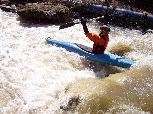Za mostem v Sedleci nás čeká poslední jez. Pod ním je sice naplaveném dřevo a kamení, ale jez po prohlídce bez potíží skáčeme. Těsně pod skokem totiž bublá přívětivý váleček, který nás ukládá jako do peřiny a posílá na další cestu. Kačák tady vtéká do vápencového kaňonu, stává se zajímavějším a teče rychleji.