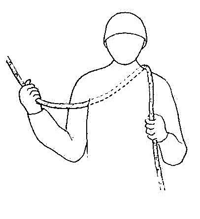 Obr. 4 - může mít nebezpečné následky, úplně selže, je-li lano vytrženo z podpaží, nesmí být použito, když má jistič na sobě silonový oděv (malé tření); jištění prvolezce jen na stupňovité skále, kde nehrozí volný pád a nebo tam, kde jsou četná postupová jištění; jištění druholezce OK, avšak křížová jištění jsou výhodnější; snadná manipulace s lanem; velmi obtížné až nemožné zafixování lana po pádu lezce - shrnutí: není to bezpečné, je však často používané pro svou jednoduchost