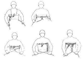 Obr. 6 - velmi spolehlivé, lano nemůže být z těla strženo; pro jištění prvolezce se nedoporučuje; jištění druholezce OK; snadná manipulace s lanem; velmi obtížné až nemožné zafixování lana po pádu lezce, zvláště při tahu směrem dolů
