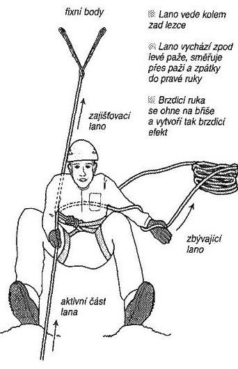 Obr. 4 - může mít nebezpečné následky, úplně selže, je-li lano vytrženo z podpaží, nesmí být použito, když má jistič na sobě silonový oděv (malé tření); jištění prvolezce jen na stupňovité skále, kde nehrozí volný pád a nebo tam, kde jsou četná postupová jištění; jištění druholezce OK, avšak křížová jištění jsou výhodnější; snadná manipulace s lanem; velmi obtížné až nemožné zafixování lana po pádu lezce - shrnutí: není to bezpečné, je však často používané pro svou jednoduchost