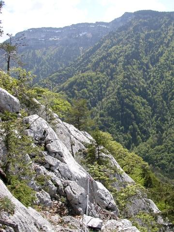 Ve Vovray, kam mě vzali, jsou hlavně položené plotny, buď s nějakou tou dírkou nebo jenom tak na tření. Snaha o převážení pohybu vzlínáním vzhůru nad ujížděním dolů mě zrovna nějak moc nebere. Naštěstí se tam taky najde cesta s nějakou tou dírkou, dírou, puklinou, spárkou či pěkným madlem. Ovšem pozor, šmejdi jsou všude. V jedné cestě za převískem někdo odstranil jištění a tak se následujících asi deset metrů nad poslední preskou oklouzaným traverzem změnilo v dobrodružnou cestu. Další den (asi jsem byl uznán způsobilým spolulezcem, za což patří dík lidem věnujících se nováčkům v našem oddíle) se jelo do Leaz.