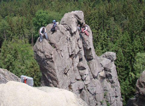 v sobotu jsme nejdříve popolézali na klasických cestách v jižní stěně Fellerovky a Hoe si udělal radost OS přelezem špekoviny Bronzový parohy VIIIb na šachtovou věž, poté jsme se rozdělili na několik skupinek (cyklisti, zasloužilé matky apod.). náš vypravěč zůstává ve skupince milovníků odlehlých kvaků, která se odebrala do jedné tajemné romantické bezvýznamné zamešené oblastičky, kde prvovystoupila dvé věžiček, a to Hadí hřbet cestou obtížnosti III nazvanou dle nestandardní lezecké techniky Skákání na koulích, a věž Hlemýžď bouldrovým problémkem Hlemejždění za IV. A pak byl Hoe vyslán do jednoho mého mnohaletého plánu na věž Milenci (kde se mimochodem nachází naše již devítiletá cesta Sonáta pro klavír klas. VII, tak významná, že ji ještě nikdo nezopakoval, a věž sama je navštívena v průměru jednou za tři roky, a to výhradně přeskokem z masivu). Hoe se vyhlemzal vnitřním solivomechovozavlhlým komínem na pilířek v mezivěží a v očekávání obtížného kroku s nadějí na pád do komína se jal hloubit ďouru. po vyhloubení a vyčištění ďoury zalepil voko chemickou maltou a slanil dolu, přece jenom má ten sajrajt nějaké požadavky na dvě hodiny tvrdnutí.