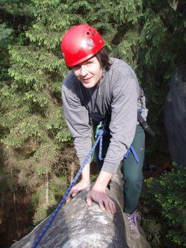 v sobotu jsme nejdříve popolézali na klasických cestách v jižní stěně Fellerovky a Hoe si udělal radost OS přelezem špekoviny Bronzový parohy VIIIb na šachtovou věž, poté jsme se rozdělili na několik skupinek (cyklisti, zasloužilé matky apod.). náš vypravěč zůstává ve skupince milovníků odlehlých kvaků, která se odebrala do jedné tajemné romantické bezvýznamné zamešené oblastičky, kde prvovystoupila dvé věžiček, a to Hadí hřbet cestou obtížnosti III nazvanou dle nestandardní lezecké techniky Skákání na koulích, a věž Hlemýžď bouldrovým problémkem Hlemejždění za IV. A pak byl Hoe vyslán do jednoho mého mnohaletého plánu na věž Milenci (kde se mimochodem nachází naše již devítiletá cesta Sonáta pro klavír klas. VII, tak významná, že ji ještě nikdo nezopakoval, a věž sama je navštívena v průměru jednou za tři roky, a to výhradně přeskokem z masivu). Hoe se vyhlemzal vnitřním solivomechovozavlhlým komínem na pilířek v mezivěží a v očekávání obtížného kroku s nadějí na pád do komína se jal hloubit ďouru. po vyhloubení a vyčištění ďoury zalepil voko chemickou maltou a slanil dolu, přece jenom má ten sajrajt nějaké požadavky na dvě hodiny tvrdnutí.