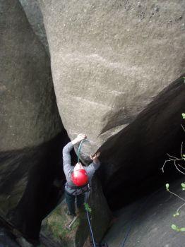 sobotní večer byl výrazně klidnější. v noci spadlo pár kapek. ráno bylo proklatě studené a větrné. opět se vytvořilo několik skupinek: bikéři (jiřík a kniha, výlet do Mařenic na oběd s několika teréními úseky), poznavači památek (nejčetnější skupina) navštívivší zámek Löwenberg (Lemberk), ze které se pak po návratu odštěpila výprava geokačerů (obskurní pojídačova kratochvíle s džípíeskou a hledáním pokladu) atd.. Vypravěč zůstává u skupiny, která po několikahodinovém taktizování vyrazila zkontrolovat tvrdnutí lepidla. Vytvrdlo. nad ním byl hlemzací nákrok doleva do dalšího krátkého komína, a pak překrok doprava do rajbasu. Hoe po rozdejchání překračuje a juž zavrtává navrtáváček a juž v něm sedí a hloubí ďouru pro voko. (pípá telefon a hoeho spolupracovnici se zrouna narodila dcéra.) Vzhledem k plánovanému harmonogramu volíme odlišnou technologii, a to kombinaci reprofilační malty a olova. Pak pár divě rajbasovooblázkových kroků a již máme vršek. Cesta je pojmenovaná po právě oznámené narodivší se Lucinka a má šestkovou obtížnost.