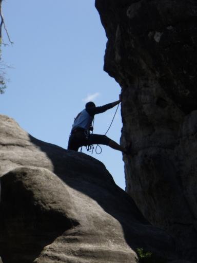 Cestu Horolezecká sedma jsme zapytlili : krásná linie, jenže VIIc nepustilo. Při slaňování od prvního kruhu si Bára zkontrolovala, že má chuchvalec lana na zemi a ten druhý konec je tak akorát, za jeden fous ještě pro jistotu zatáhla, aby to bylo jó sichr. Posledních pár metrů proto absolvovala rychleji, než jí bylo milé, s dopadem přímo na pozadí. Zatáhla za špatný konec lana.