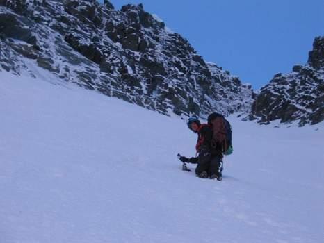 Výstup Pallaviciniho roklí: spodní dvě třetiny firn 50°, horní třetina firn 55°, poslední dvě délky 80m led 60° a rozbitá skála III, vrcholová převěj sníh 80°.