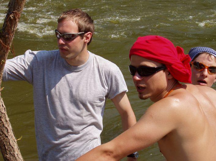 V neděli na cestu domů volíme netradiční dopravní prostředek, otevřenou debl kanoi Vydru z Týnce nad Sázavou do Pikovic. Super, půjčovna Bisport má skvělou organizaci a sličné telefonistky, jen ta masovost je dost šílená. Ale jedem. Úspěšnější dvojka Milan-Zahrada absolvuje cestu bez nehody, my dva s Nikou se dvakrát koupeme. Z toho ta druhá koupačka není úplně bez následků - jez v Kamenném Pívoze nás dostal a moje kosti zblízka poznávají tvrdost sázavského kamení. Fuj tajxl. Na nohu se ale nakonec postavit můžu, tak pokračujem dál, už v pohodičce až do Pikovic.