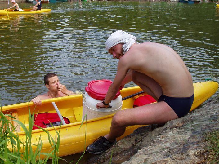 V neděli na cestu domů volíme netradiční dopravní prostředek, otevřenou debl kanoi Vydru z Týnce nad Sázavou do Pikovic. Super, půjčovna Bisport má skvělou organizaci a sličné telefonistky, jen ta masovost je dost šílená. Ale jedem. Úspěšnější dvojka Milan-Zahrada absolvuje cestu bez nehody, my dva s Nikou se dvakrát koupeme. Z toho ta druhá koupačka není úplně bez následků - jez v Kamenném Pívoze nás dostal a moje kosti zblízka poznávají tvrdost sázavského kamení. Fuj tajxl. Na nohu se ale nakonec postavit můžu, tak pokračujem dál, už v pohodičce až do Pikovic.