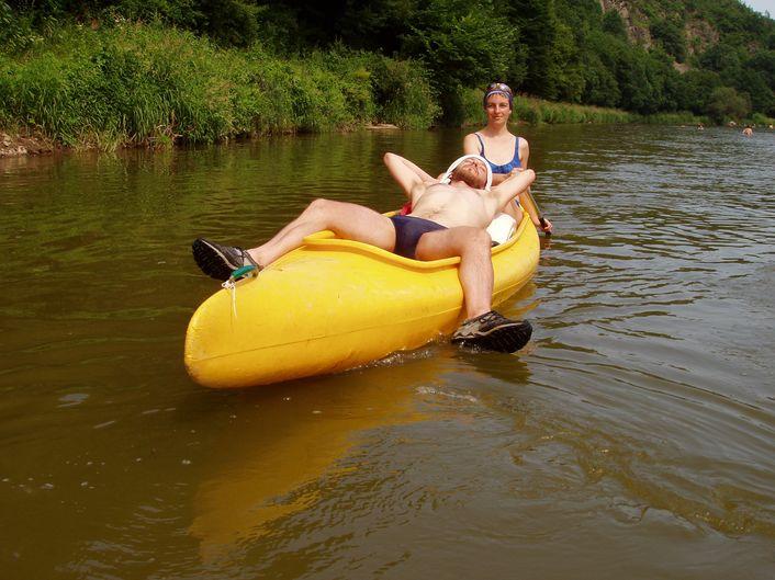 V neděli na cestu domů volíme netradiční dopravní prostředek, otevřenou debl kanoi Vydru z Týnce nad Sázavou do Pikovic. Super, půjčovna Bisport má skvělou organizaci a sličné telefonistky, jen ta masovost je dost šílená. Ale jedem. Úspěšnější dvojka Milan-Zahrada absolvuje cestu bez nehody, my dva s Nikou se dvakrát koupeme. Z toho ta druhá koupačka není úplně bez následků - jez v Kamenném Pívoze nás dostal a moje kosti zblízka poznávají tvrdost sázavského kamení. Fuj tajxl. Na nohu se ale nakonec postavit můžu, tak pokračujem dál, už v pohodičce až do Pikovic.