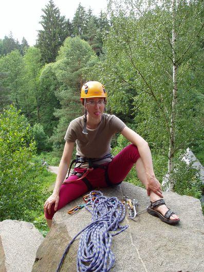 Ke koupačce přichází Milan a vyrážíme znovu do stěn. Využívám příležitosti a lezu onu šestku, co jsem šel za Radimem, na prvním. Velká radost! Super. Nika a Deny zatím šplhají Starou na prvním, stejně jako Milan. pak ještě Schody (4) a můj pokus o Prašnou I (7-), skončený z nedostatku odhodlání u druhého borháku. Na konec ještě Milan končí tam, kde my jsme začínali - na Nejistých římsách a já šplhám Krávu uzenou (7). Ten poslední metr je ale na mě moc. Po asi devátém pádu to vzdávám a stejně dopadl i Zahrada, který to zkouší na top rope. Úspěšný stejným stylem je nakonec Milan, pro mě tedy zůstává výzva do příště.