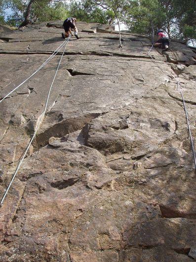 Přijíždí Radim s celou rodinkou a vyvádí nějakou šestku vpravo od Staré, kterou zatím na prvním vede Zahrada. Ta šestka je fakt krásná plotnovitá cesta, lezu ji na top rope, ale říkám si, že si ji musím dát příště na red point.