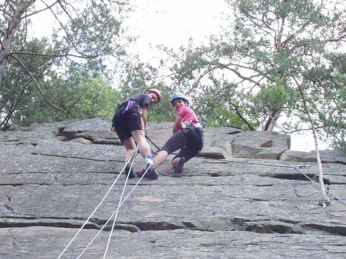 Ke koupačce přichází Milan a vyrážíme znovu do stěn. Využívám příležitosti a lezu onu šestku, co jsem šel za Radimem, na prvním. Velká radost! Super. Nika a Deny zatím šplhají Starou na prvním, stejně jako Milan. pak ještě Schody (4) a můj pokus o Prašnou I (7-), skončený z nedostatku odhodlání u druhého borháku. Na konec ještě Milan končí tam, kde my jsme začínali - na Nejistých římsách a já šplhám Krávu uzenou (7). Ten poslední metr je ale na mě moc. Po asi devátém pádu to vzdávám a stejně dopadl i Zahrada, který to zkouší na top rope. Úspěšný stejným stylem je nakonec Milan, pro mě tedy zůstává výzva do příště.