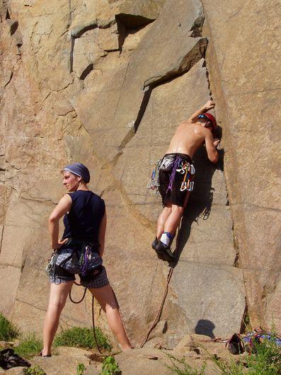 Ke koupačce přichází Milan a vyrážíme znovu do stěn. Využívám příležitosti a lezu onu šestku, co jsem šel za Radimem, na prvním. Velká radost! Super. Nika a Deny zatím šplhají Starou na prvním, stejně jako Milan. pak ještě Schody (4) a můj pokus o Prašnou I (7-), skončený z nedostatku odhodlání u druhého borháku. Na konec ještě Milan končí tam, kde my jsme začínali - na Nejistých římsách a já šplhám Krávu uzenou (7). Ten poslední metr je ale na mě moc. Po asi devátém pádu to vzdávám a stejně dopadl i Zahrada, který to zkouší na top rope. Úspěšný stejným stylem je nakonec Milan, pro mě tedy zůstává výzva do příště.