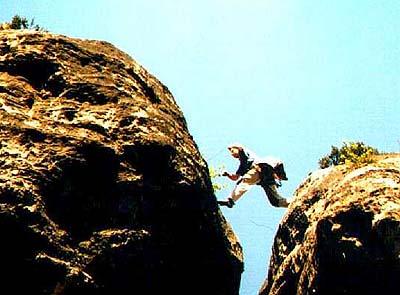 Přeskok mezi Dvojčaty, který letos Rybíz zpopularizoval na Lezec.cz (http://www.lezec.cz/clanek.php?key=1214), vloni skočil napřed on, poté na to šli prckové. Bára Beránková ho zvládla v pohodě, Matesovi Turkovi ovšem poradil, aby nechal ruce nahoře, a dopadlo to tak, jak vidíte na fotce.