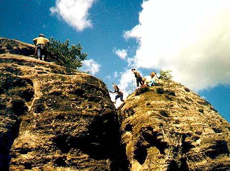 Přeskok mezi Dvojčaty, který letos Rybíz zpopularizoval na Lezec.cz (http://www.lezec.cz/clanek.php?key=1214), vloni skočil napřed on, poté na to šli prckové. Bára Beránková ho zvládla v pohodě, Matesovi Turkovi ovšem poradil, aby nechal ruce nahoře, a dopadlo to tak, jak vidíte na fotce.