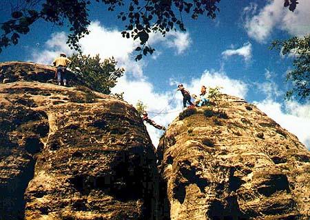 Přeskok mezi Dvojčaty, který letos Rybíz zpopularizoval na Lezec.cz (http://www.lezec.cz/clanek.php?key=1214), vloni skočil napřed on, poté na to šli prckové. Bára Beránková ho zvládla v pohodě, Matesovi Turkovi ovšem poradil, aby nechal ruce nahoře, a dopadlo to tak, jak vidíte na fotce.