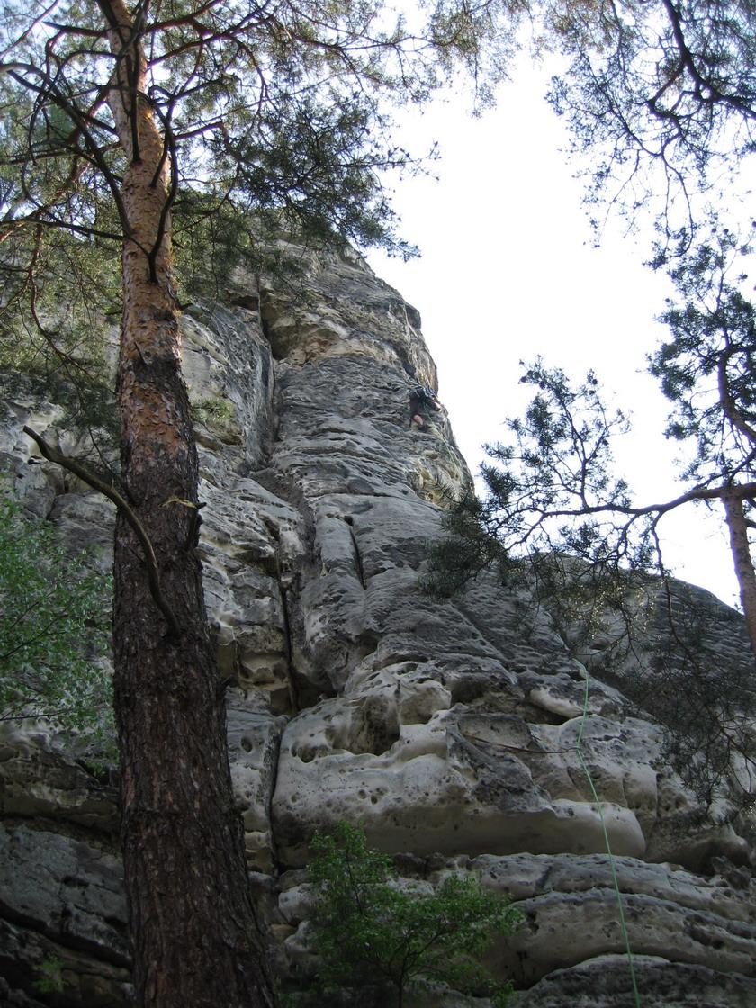 Hledáme další cíle, trochu bloudíme, Gobo zapytlí postupně 3 cesty, ale o tom se rozepisovat nebudu. Dneska není náš tahoun asi ve formě.:o) Teda zdálo se to tak... ale další cestou, Normální cesta V na Osudovou věž dokazuje, že má morál.. v 8 metrech bez jištění přes zamechovatělý rajbas, kde dole žádné jehličí, ale asfaltová cesta, to by se mi teda vůůůůůbec nelíbilo. No jak jsem se přesvědčil, nebylo to těžké.. ale to je opět pohled z dolního konce špagátu.:o)